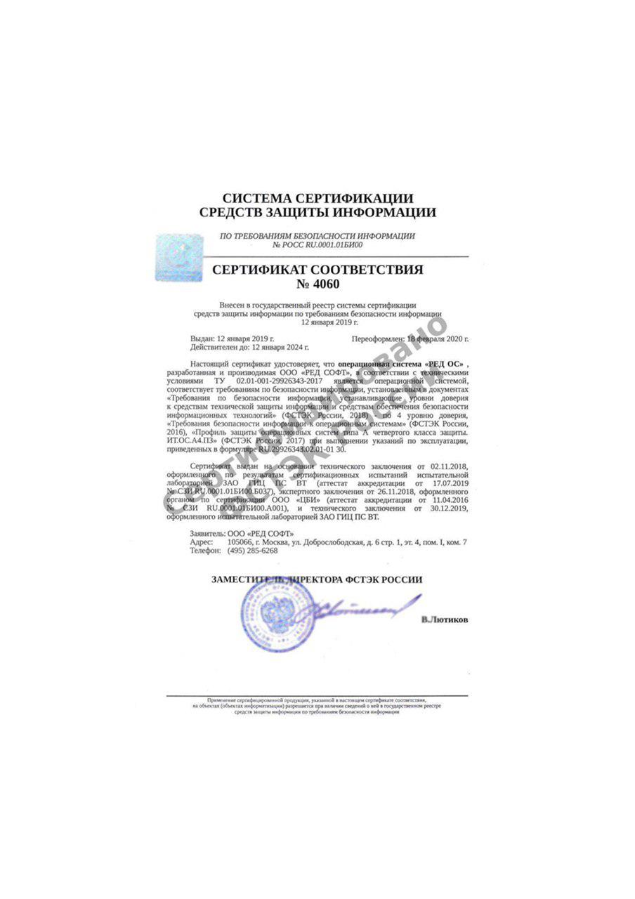 RED OS is a Russian general-purpose operating system of the Linux family for servers and workstations. The product is certified by the FSTEC of Russia (Cert. No. 4060 dated January 12, 2019) and is registered in the Unified Register of Russian Software and Databases of the Ministry of Communications of Russia (No. 3751).
